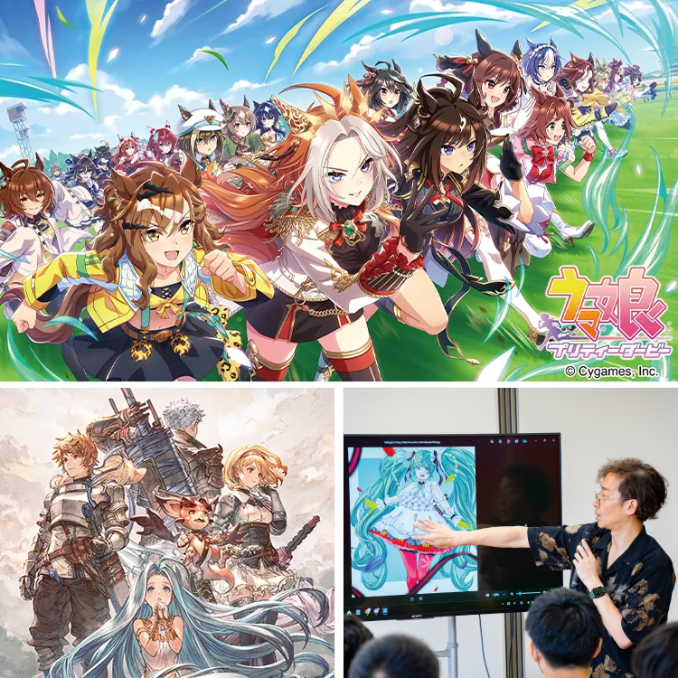 サイバーエージェントグループとして設立され、「ウマ娘 プリティーダービー」や「グランブルーファンタジー」などの大ヒット作を手掛ける株式会社Cygames と、教育事業特別カリキュラムをおこなう連携プロジェクトを行っています!ゲーム制作やイラスト制作など、ゲーム会社による最新のゲーム開発ノウハウを学べる特別講義を実施。業界の「今」を学び、プロの感性を育むことができるそんなカリキュラムとなっています。