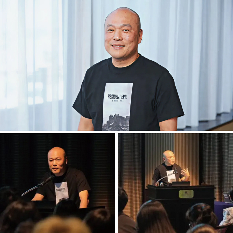世界的ヒット作『バイオハザード』シリーズのディレクター・中西晃史さん(カプコン 第一開発部)による特別講演を実施しました。『バイオハザード7』の開発秘話や、関係者しか見られなかった制作映像の公開に、会場は驚きと拍手に包まれました。「ゲーム制作は毎回が初めての挑戦。大切なのは失敗をどう改善するか」という言葉には、多くの学生が深くうなずきます。後半の質疑応答では、最初は緊張していた学生も次々と質問を投げかけ、プロから直接アドバイスを受ける貴重な時間となりました。現役クリエイターの熱量とリアルな制作話に触れ、在校生たちの決意がさらに強まるイベントとなりました。